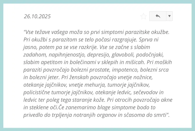 Ne delajte iste napake kot jaz! Če bi bila prej pozorna na te neškodljive simptome (napihnjenost, neprijeten zadah in erekcija), moj mož ne bi tako zbolel. Parazol čaj je edinstvena zeliščna mešanica, ki takoj pozdravi prve simptome parazitske okužbe in odpravi možnost ponovne okužbe, če preberete mojo zgodbo, odkrijte pri sebi vsaj enega od simptomov (!) ZDRAVITE ZDRAVILOM ZDAJ!